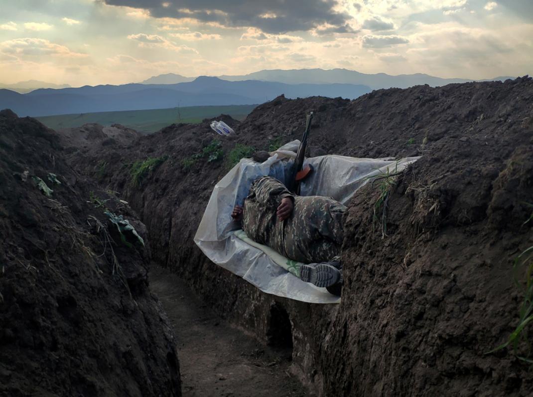 Maintenant, je regarde cette photo et il me semble que c'est un symbole de notre Arménie belliqueuse. Il est fort, puissant, large d'épaules, mais il dort et se repose. Pour moi, c'est un symbole de notre Arménie vaincue, pas de soldat dans le sens où nous n'étions pas préparés à la guerre. La photo n'a rien à voir, le soldat dort pour lui-même, mais quand on la dépouille de ses spécificités, on la porte à un autre niveau et on jette un regard en arrière, comme si notre défaite était là aussi, dans cet instant.