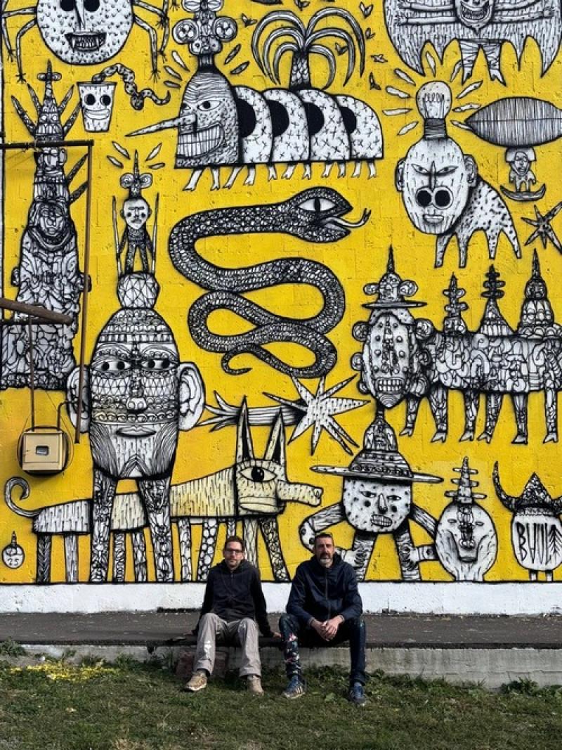 Ce sont les mains de Bault, street artiste français venu spécialement de Paris pour ce projet, qui tiennent les sprays de peinture. Sculpteur sur bois et peintre avant tout, il baigne dans l’art depuis son plus jeune âge : il a grandi entouré de livres d’art et a commencé à dessiner très tôt. Avec l’arrivée du hip-hop et du graffiti, il a choisi les murs parisiens comme terrain d’expression. « Quand tu peins dans la rue, c’est très visible : les gens prennent des photos, et c’est ce qui donne de la visibilité », explique-t-il.