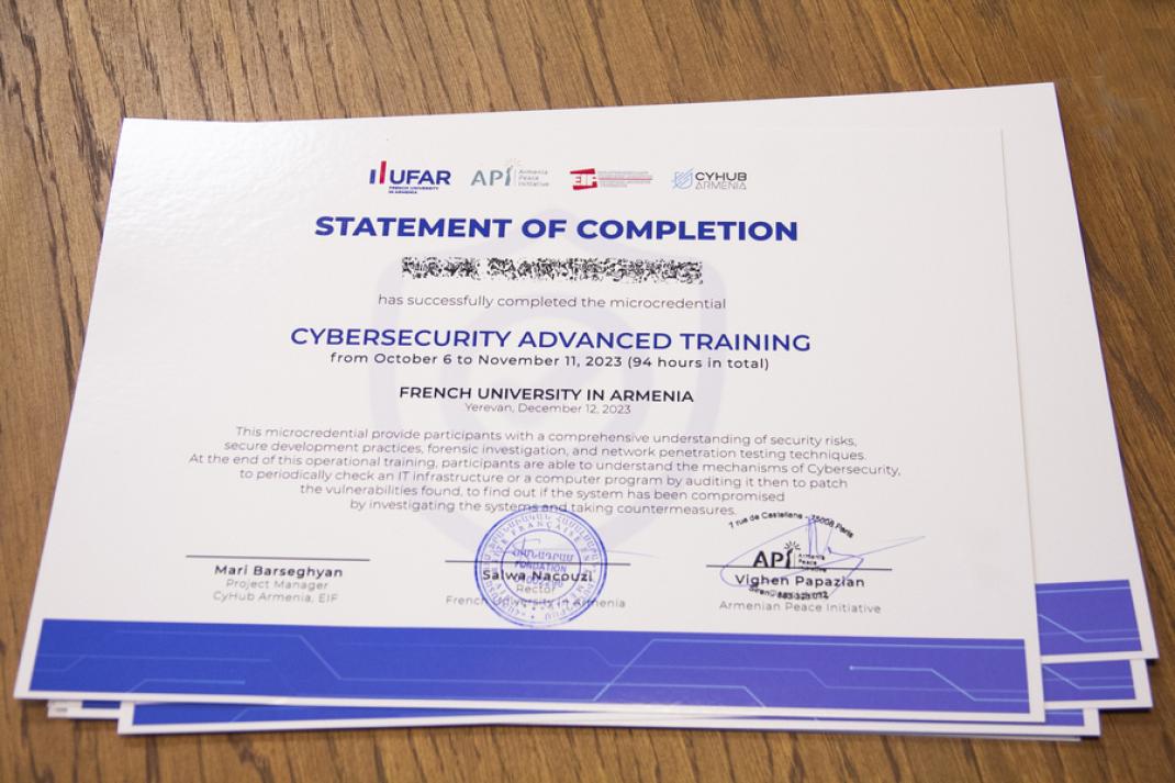 Vighen Papazian, président d ’Armenia Peace Initiative, l'un des porteurs du projet et contributeur de cette formation à la cybersécurité était présent à la cérémonie de remise des certificats, le 12 décembre. « La cybersécurité et l'indépendance de la sécurité technologique sont des éléments constitutifs de la sécurité au sens large, indispensable pour faire exister la paix en Arménie et permettre à ses entreprises d'envisager l'avenir avec espoir et sérénité. La guerre cyber est un élément très déstabilisant qui n'est pas encore contré. Pourtant, tout est informatisé, de la production d'électricité aux systèmes professionnels traditionnels, les hôpitaux, les administrations… L'Arménie doit donc être à même de prévenir et de répondre à d'éventuelles attaques.