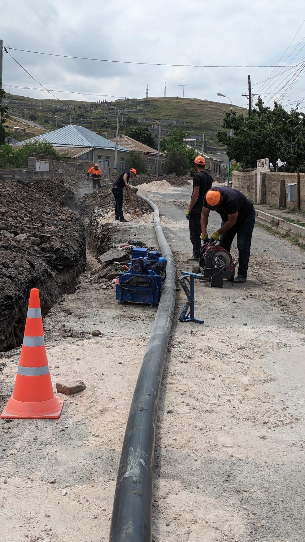 Rue Abovyan, dans la ville de Martuni, des travaux de construction sont en phase active : l’ensemble du réseau de distribution d’eau potable datant des années 1960 est en totale réhabilitation.