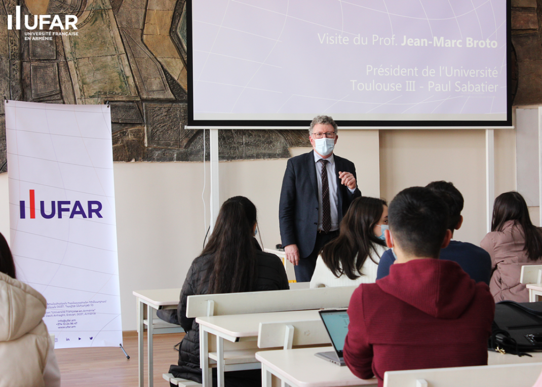 À l'occasion du premier Forum francophone sur la qualité dans l’enseignement supérieur en Europe centrale et orientale organisé par l'UFAR le 24 et 25 février 2022, l'Université française en Arménie recevait Jean-Marc Broto, Président de l'université Toulouse III - Paul Sabatier. C'était sa première visite en Arménie, l'occasion pour ce dernier de se rendre compte du fonctionnement des programmes de coopération établis avec l'UFAR depuis 2018.