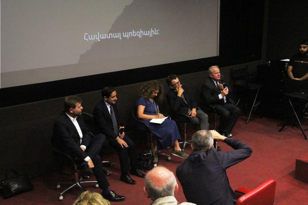 Jean-Christophe Buisson : « On essaye chez nous d'influencer l'opinion publique par les médias ou la politique mais à notre niveau, notre marge de manœuvre réelle c'est la culture, le cinéma et la littérature. L'idée était de venir et de montrer aux arméniens, par le biais de la culture, qu'on ne les oubliait pas, que l'on pensait à eux. Oui, l'Artsakh existe, oui, les Arméniens d'Artsakh existent, et ils existent tellement qu'ils s'intéressent à la culture française. Et puisqu'ils s'y intéressent, nous avons voulu la leur apporter, comme nous l'apportons ce soir à Erevan. Le meilleur vecteur de la vie, c'est la culture. À partir du moment où l'on échange de la culture avec un peuple, il passe aussi un courant de vie. »
